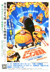 開催期間 2026年1月31日 AM9:00 - PM12:00 Add To Calendar Download ICS Google Calendar iCalendar Office 365 Outlook Live 予約 ¥0.00 開催場所 丹生川文化ホール 岐阜県 高山市 丹生川町町方1 イベントタイプ まち協行事 みなさんに人気のミニオンシリーズ最新作の上映会をします! 寒くなったこの時期に友達・家族・もちろん一人でも映画を見てリフレッシュしませんか? たくさんのご来場をお待ちしております。 上映作品:怪盗グルーのミニオン超変身 開催日:令和8年1月31日(土) 午前9時30分開場 10時開演 11時35分終了予定 場 所:丹生川文化ホール 大ホール 来場者特典:期間限定キャンペーンカード(今回のみ) 座席数:先着500席 参加費:500円/1名 予約 チケット 参加される代表者の方の氏名・電話番号・参加人数をご入力ください 席数 1 2 3 4 5 6 7 8 9 10 11 12 13 14 15 16 17 18 19 20 ご登録情報 名前 電話 メールアドレス コメント 私は、上に入力したデータが プライバシーポリシー ウェブサイトによって収集・保存されることに同意します。 予約概要 1 x ミニオン超変身鑑賞チケット ¥0.00 合計金額 ¥0.00 Taxes included
